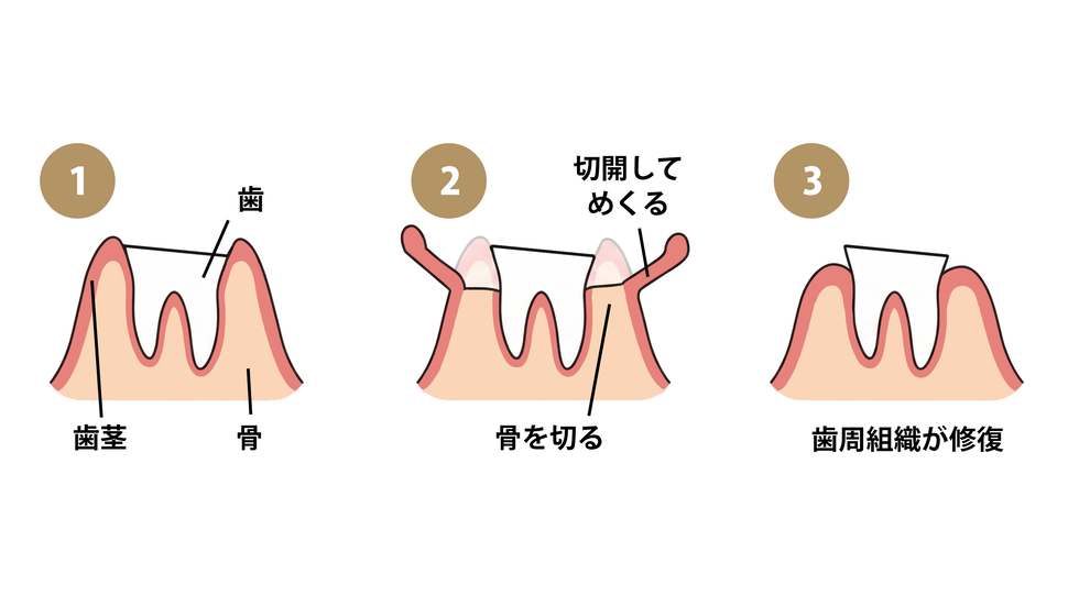 局所麻酔を行い、歯茎を少し下げたり周囲の骨の形を微調整したりしながら、埋もれていた健康な歯を表面に出していきます。処置が終わったら細い糸で縫合し、その日は終了です。後日、抜糸を行います。